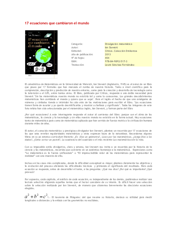 17 ecuaciones que cambiaron el mundo Categoría: Divulgación matemática Autor: Ian Stewart Editorial: Crítica. Colección Drakontos Año de publicación: 2013 Nº de hojas: 464 ISBN: 978-84-9892-517-3 Traducción: Laura Sánchez Fernández El catedrático de Matemáticas en la Universidad de Warwick, Ian Stewart (Inglaterra, 1945) es el autor de un libro que pasea por 17 fórmulas que han.