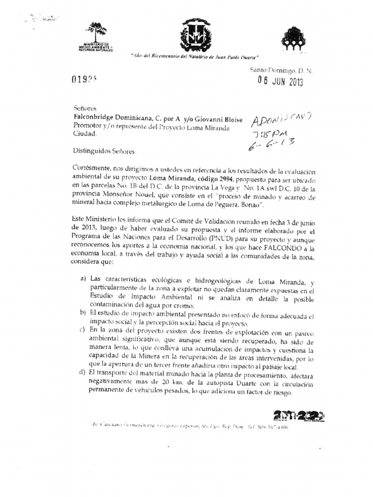 Carta de Medio Ambiente a Falconbridge DominicanaLoma Miranda