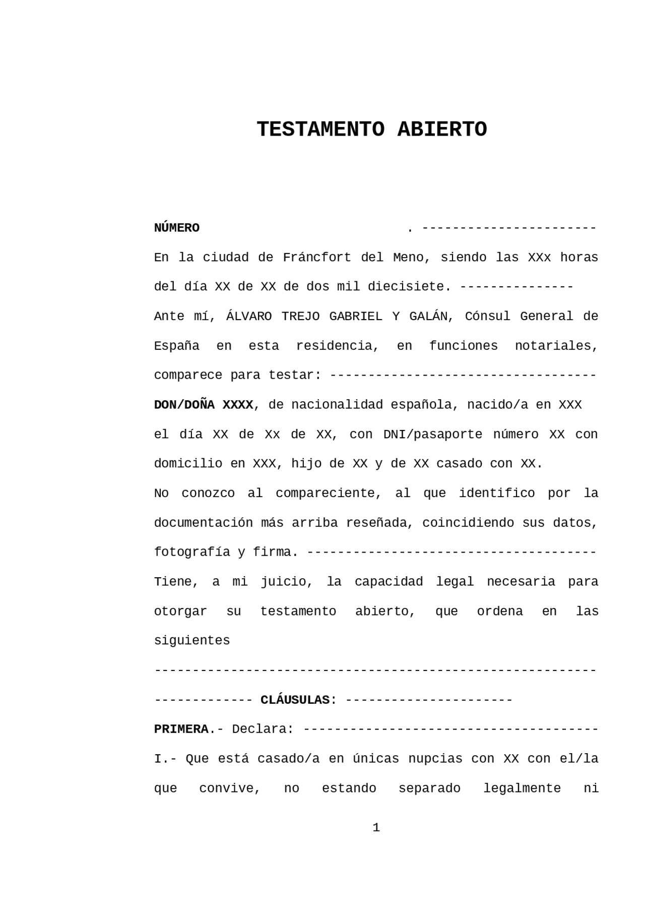 Paso siguiente. Modificar el modelo. Tenga presente que el testamento abierto tiene que celebrarse ante un Notario Público, sin necesidad de la intervención de más personas ya que no es necesaria la presencia de testigos (solamente en casos excepcionales como por ejemplo cuando el testador no sepa firmar el testamento, que sea ciego o no.