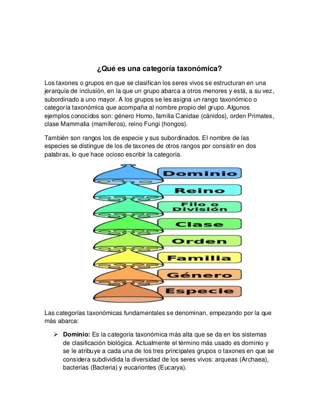 Categorías Taxonómicas. Los taxones o grupos en que se clasifican los seres vivos se estructuran en una jerarquía de inclusión, en la que un grupo abarca a otros menores y está, a su vez, subordinado a uno mayor. A los grupos se les asigna un rango taxonómico o categoría taxonómica que acompaña al nombre propio del grupo.