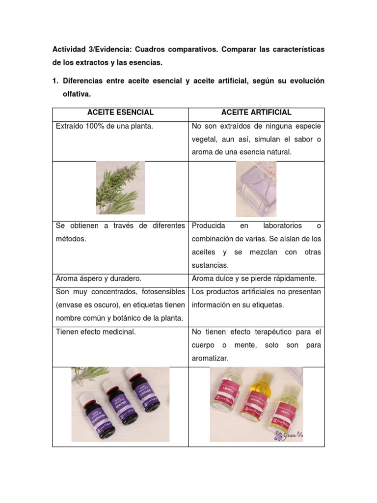 Elabore un cuadro comparativo en el que establezca las diferencias entre un aceite esencial y uno artificial, según su evolución olfativa. El siguiente cuadro comparativo se presenta en base a los conocimientos adquiridos y en el material de formación proporcionado para esta actividad.
