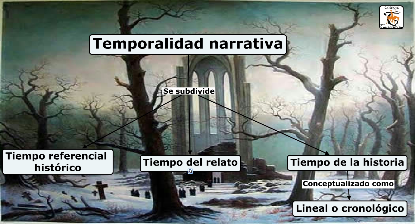 El tiempo, al interior de una obra narrativa, es complejo, ya que no necesariamente se corresponde a la sucesión temporal del mundo real. El tiempo narrativo es manejado y dispuesto de acuerdo a las necesidades de la progresión de las acciones y puede mantenerse de dos formas: tiempo de la historia y tiempo del relato o discurso.