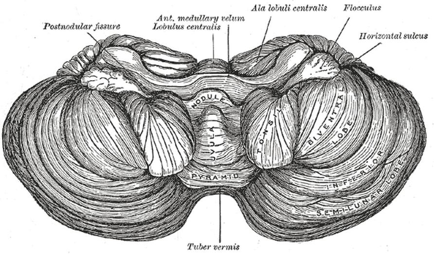 También el cerebelo presenta dos estructuras laterales, los hemisferios cerebelosos, que están unidos en el centro por una estructura alargada como una lombriz, el vermis. La superficie del cerebelo se ve como una estructura laminada, formada por numerosas folias u circunvoluciones transversas, que van desde el borde externo de cada hemisferio hasta el vermis.