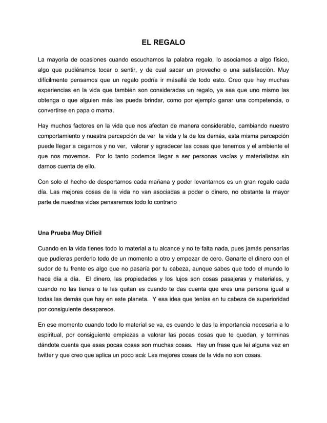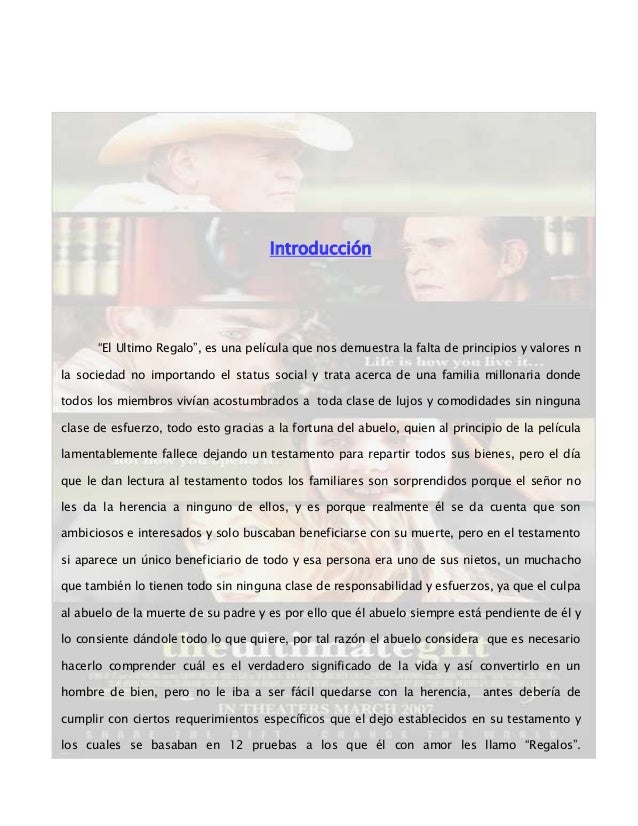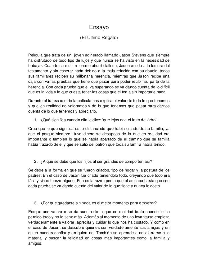 View PDF. Ensayo sobre la película el ultimo regalo En esta película podemos observar algunas realidades que muchas veces ignoramos, ya que realmente existen personas que creen que el dinero lo es todo en la vida, personas que por tener una buena posición social y económica no se dan cuenta que llegan a ser personas egoístas, cada vez mas.