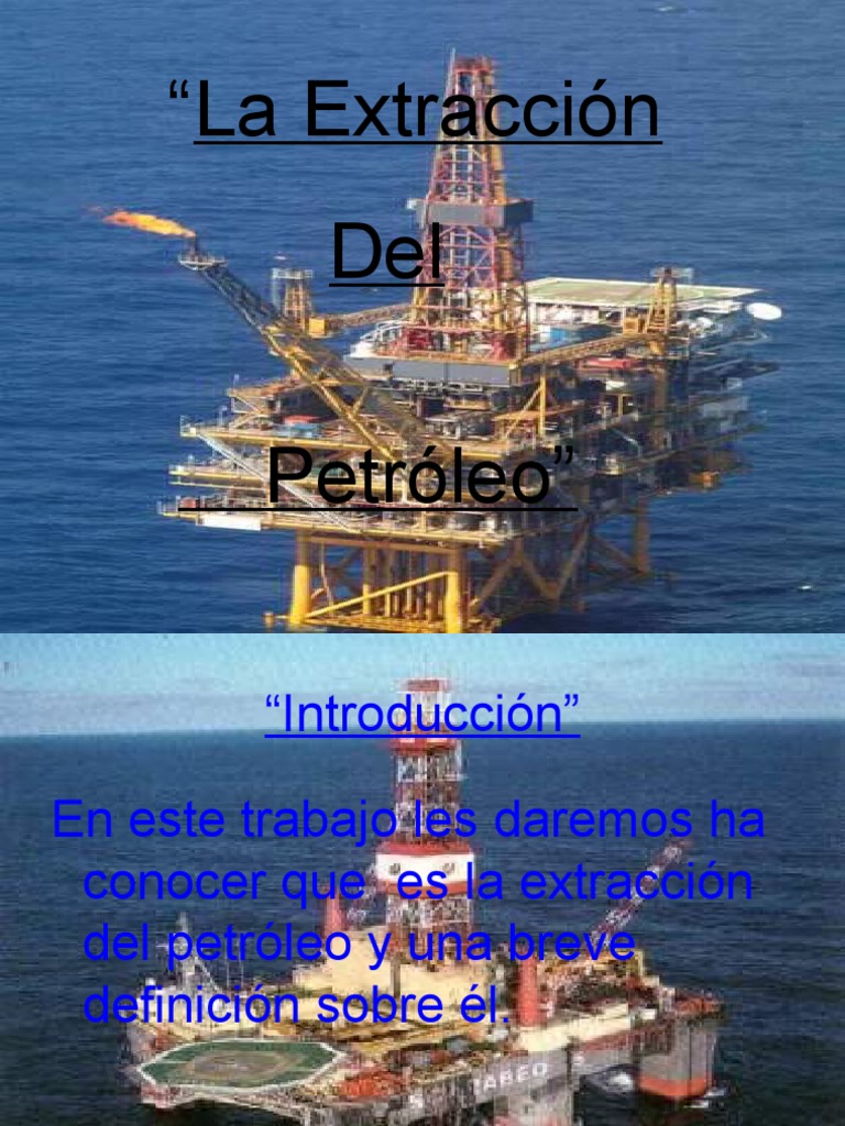 Paso 1: Preparación del terreno. Paso 2: Perforación del pozo. Paso 3: Separación y transporte. Paso 4: Refinación. Métodos de extracción del petróleo. Método a percusión. Método a rotación. Perforación submarina. Últimos avances en la extracción del petróleo.