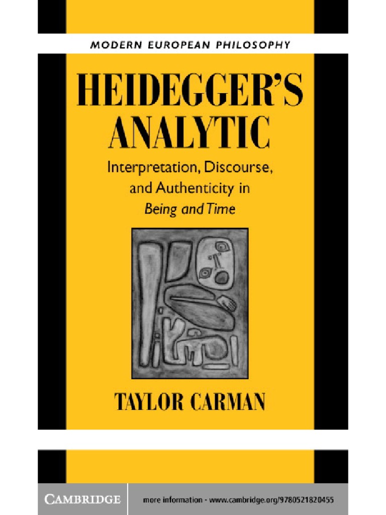 view of Being and Time and a chapter reviewing the genesis of this seminal work. The fi nal chapter situates Being and Time in the context of Heidegger's later work. The remaining chapters exam-ine the core issues of Being and Time, including the question of being, the phenomenology of space, the nature of human being (our