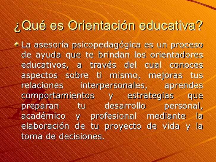 La orientación educativa también es considerada como un servicio técnico, personal y sistemático que se ofrece al alumnado desde el sistema educativo, con el fin de ayudarlo a conocer sus posibilidades y limitaciones, así como las de su medio, para que tome las decisiones adecuadas para obtener el máximo desarrollo personal, académico y.