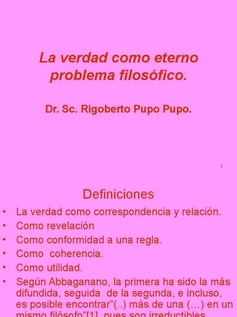 LA VERDAD COMO ETERNO PROBLEMA FILOSOFICO. Dr. Rigoberto Pupo Pupo. En la historia de la filosofía el problema de la verdad siempre ha sido objeto de reflexión. Diversas definiciones e interpretaciones han tratado de aprehender un contenido que aparentemente resulta inaprehensible y huidizo. Sin embargo se destacan cinco conceptos por su.
