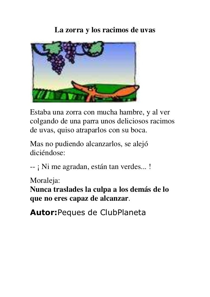 La Zorra y los racimos de uvas. Estaba una zorra con mucha hambre, y al ver colgando de una parra unos deliciosos racimos de uvas, quiso atraparlos con su boca. Mas no pudiendo alcanzarlos, a pesar de sus esfuerzos, se alejó diciéndose: — ¡Ni me agradan, están tan verdes! FIN. Nunca traslades la culpa a los demás de lo que no eres capaz.