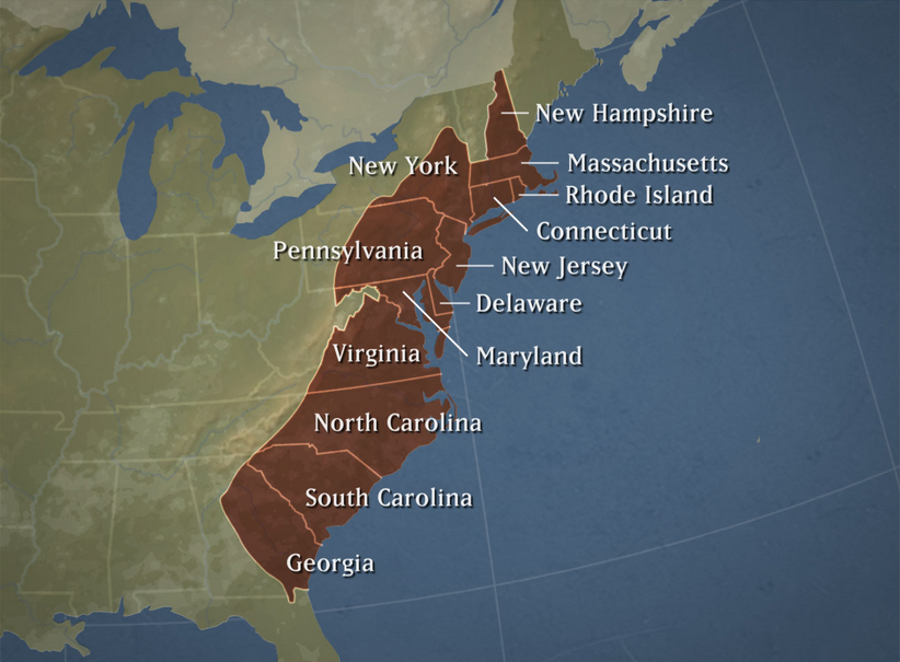 Estas colonias se extendían de norte a sur y se encontraban en el siguiente orden: Massachusetts, Nuevo Hampshire, Rhode Island, Connecticut, Nueva York, Pensilvania, Nueva Jersey, Delaware, Maryland, Virginia, Carolina del Norte, Carolina del Sur y Georgia. Estas colonias eran conocidas como las colonias inglesas en América del Norte y.