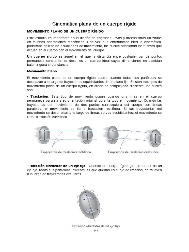 Este documento describe los diferentes tipos de movimiento plano de un cuerpo rígido, incluyendo la traslación, la rotación alrededor de un eje fijo, y el movimiento combinado de traslación y rotación. También explica conceptos como posición, velocidad, desplazamiento angular, velocidad angular y aceleración angular, y presenta ejemplos de problemas que involucran estos tipos de.