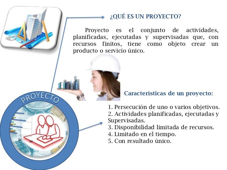 Todos los tipos de proyectos tienen en común una serie de características: Cuentan con un propósito. Se resumen en objetivos y metas. Se han de ajustar a un plazo de tiempo limitado. Cuentan con, al menos, una fase de planificación, una de ejecución y una de entrega. Se orientan a la consecución de un resultado.