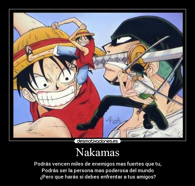 Posted on 4 mayo 2010 por Mc. Nakama, es el término japonés para amigo, camarada, de la tripulación, aliado, compañero o pandilla. En la versión japonesa del anime One Piece, este término tiene un significado más profundo, describiendo los amigos que se parecen más a la familia, especialmente en el contexto de la tripulación de Luffy.