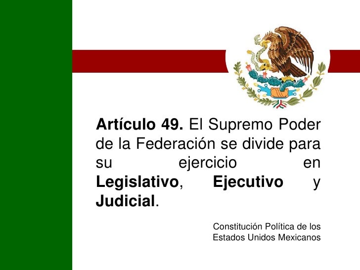 En México, nuestra Constitu-ción establece que el Supremo Poder de la Federación se divide, para su ejercicio, en Legislativo, Ejecutivo. Judicial y que, como regla general, no podrán reu-nirse dos o más de estos Poderes en una sola persona. corporación, lo que sustenta el principio comple-mentario de autonomía de cada uno de ellos.