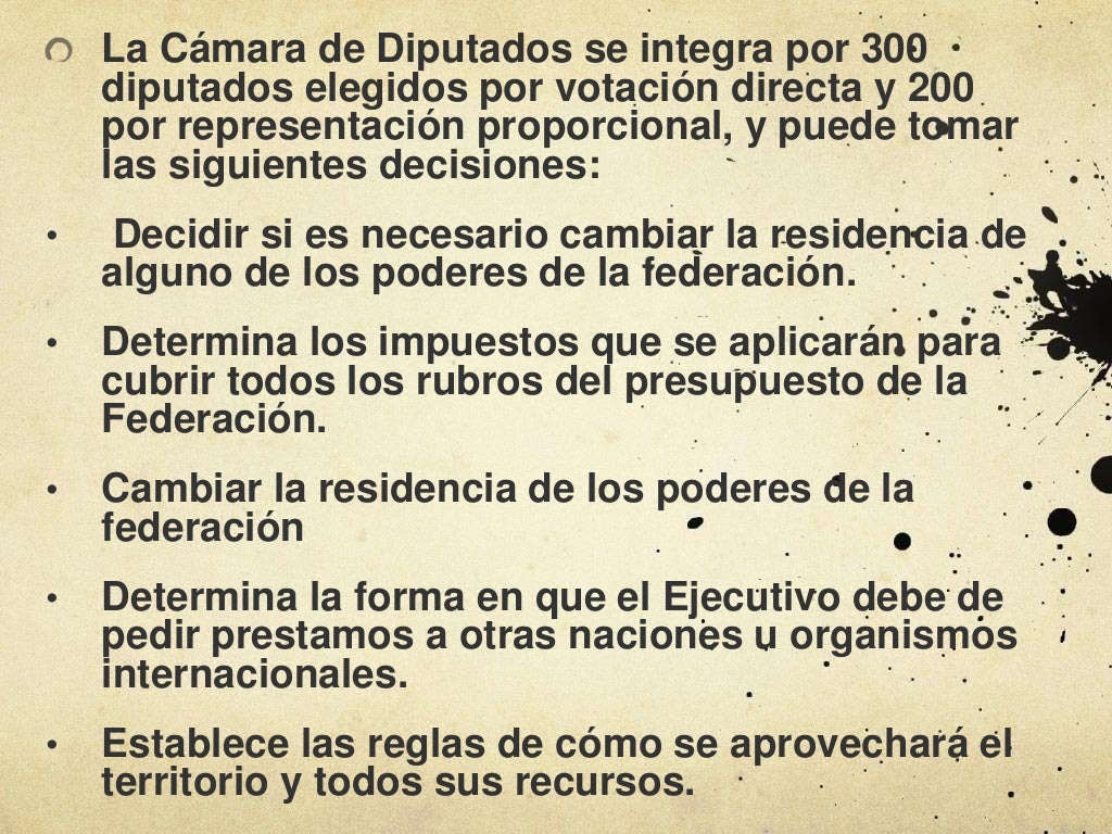 El poder Legislativo se integra por el Congreso de la Unión, el cual consiste en: Cámara de Diputados. Senado de la República. Su función es elaborar, modificar y aprobar las leyes existentes de acuerdo a las necesidades y opinión de los ciudadanos.
