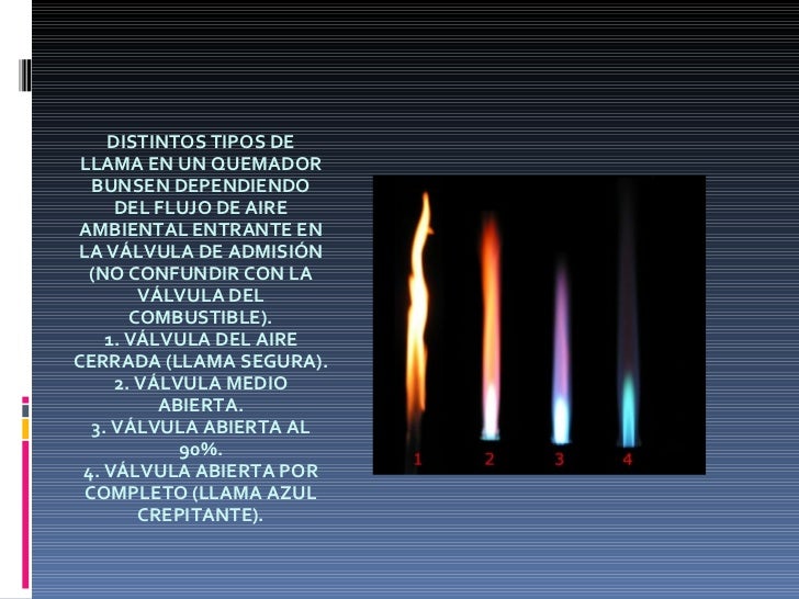 Las llamas del quemador de Bunsen dependen del flujo de aire en los agujeros de garganta (en el lado del quemador, no de la válvula de aguja para el flujo de gas): 1. agujero de aire cerrado (llama de seguridad utilizada para la iluminación o por defecto), 2. agujero de aire ligeramente abierto, 3. agujero de aire medio abierto, 4. agujero de aire totalmente abierto (llave azul rugiente).