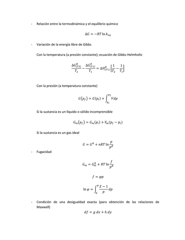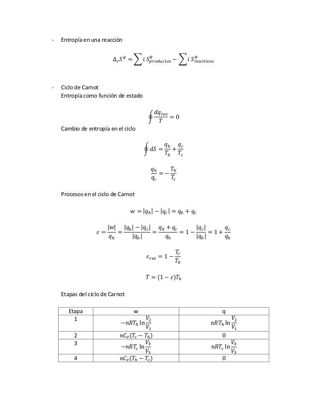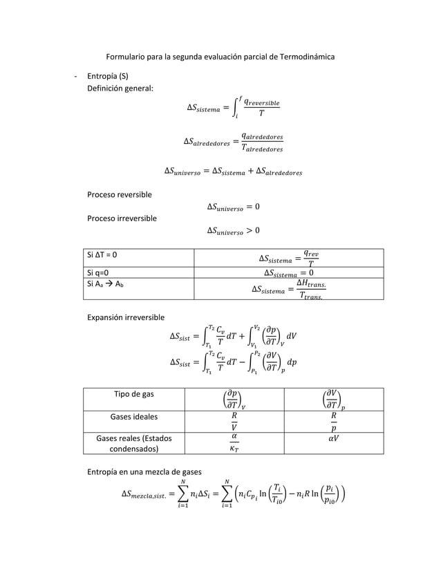 Formulario sobre la Segunda y Tercera Ley de la Termodinámica