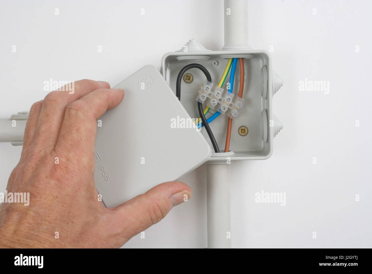 Cableado eléctrico a través de tubos y una caja para instalación exterior Fotografía de stock